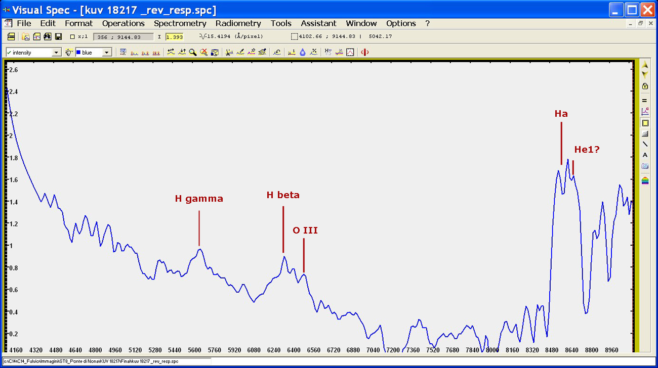 2- La difficoltà di individuazione delle righe stesse, tenuto conto che l'unico spettro professionale reperibile on line dell'oggetto , al NED (NASA IPAC Extragalactic Database) è nel lontano IR, tra 46 e 200 micron.I dati certi sono quindi 2: il redshift, pari a 0.297, come risulta dal NED stesso. ed il tipo di spettro, comune ad altri QSO, di tipo Seyfert 1,l ovvero quello di con righe allargate alla base e sottili sopra, essenzialmente della serie di Balmer dell'Idrogeno (HG, Hb e Ha) e dell'OIII.Si trattava quindi di individuare tali righe nella loro esatta collocazione nel profilo spettrale del KUV 18217.Ora, sulla base del valore di z del NED, la lunghezza d'onda osservata di tali righe dovrebbe essere, sulla base della formula dL= z x L (dL e L rispettivamente l'incremento di lunghezza d'onda e la lunghezza d'onda a riposo) come segue: