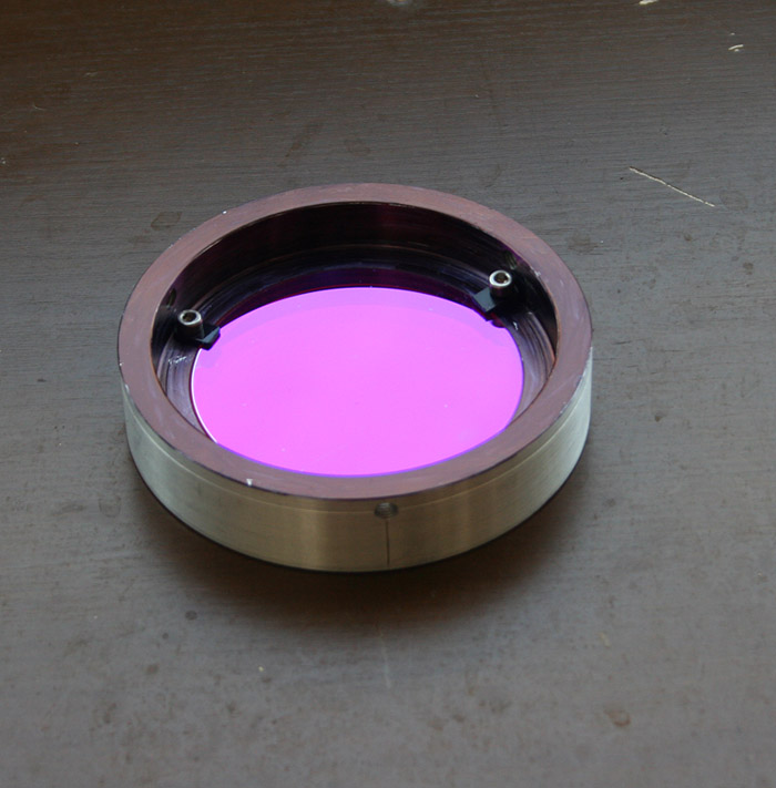 La cella col filtro è stata inserita poi a pressione nel tubo ottico sino alla distanza di circa 25 cm dall'obiettivo; oltre non è stato possibile andare per la presenza del primo diaframma di campo di alluminio leggero, collegato agli altri diaframmi e quindi non rientrabile senza dover modificare pesantemente il tubo.A tale distanza, considerando un campo di piena luce al fuoco corrispondente al BF 5 , appunto di 5 mm, l'apertura libera dello strumento risultava di 93 mm, quindi già una apertura notevole.La visione dell'ERF attraverso l'obiettivo si presentava come nella foto che segue.