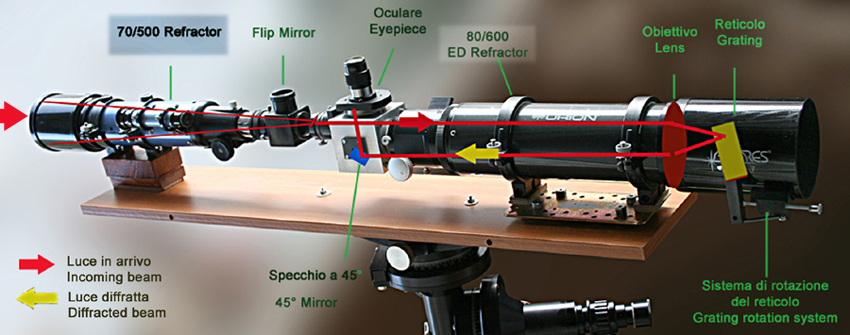 di un rifrattore ed al reticolo, e con l'oculare o la camera posti a 45°