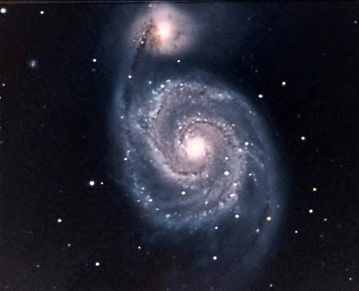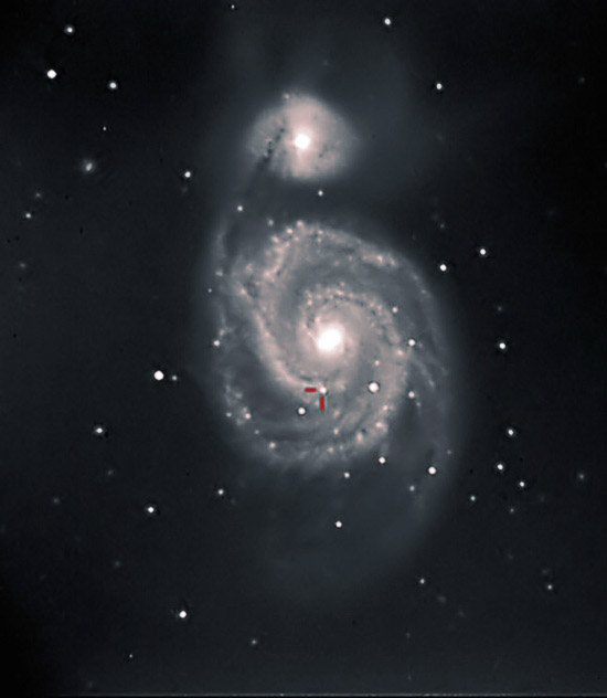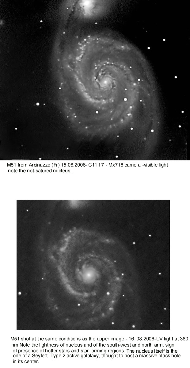 Le due immagini soprastanti mostrano la galassia M51 nei Cani da Caccia, a 30 milioni di A.L.dalla terra sia in luce bianca (la prima ) che in UV a 380 nm.Le parti più brillanti della seconda immagine sono le regioni di formazione stellare ed il nucleo attivo Seyfert tipo2 della galassia stessa: L'immagine che segue è stata invece ottenuta nell'Agosto 2007 con il C11 ad f 7 ed una camera Atik 16 HR in bin 2 x2 enfatizzando la componente IR con il sistema LIRB , da me applicato, ed in via di sperimentazione.l'immagine è stata composta da tre riprese , rispettivamente di Luminanza con IR cut, Blu, ed IR Pass.La sintesi LRGB è stata così effettuata L: L+Ircut; R: IR; G: IR+Blu; B: Blu la dominante colore è stata poi corretta via software.Il sistema permette di evidenziare l'apporto Ir, penetrando maggiormente attraverso i bracci della spirale.Le stelle che emettono in tale banda spettrale appaiono color arancio o rosso.Tale sistema non può essere tuttavia adattato a tutte le galassie con risultati estetici apprezzabili, in quanto per la maggior parte di esse che non siano di Seyfert tipo 2 come M51, e che non emettano in modo notevole nel blu si ottiene una pesante dominante cromatica verde, che può essere comunque corretta, ma che dà risultati estetici finali non piacevoli.Il sistema si prefigge quindi, nelle mie intenzioni,e con alcune modifiche che saranno illustrate a parte nel sito, di evidenziare la componente IR delle emissioni di oggetti stellari e nebulari, prescindendo da risultati estetici.Esso è stato usato per evidenziare due stelle a forte emissione infrarossa nel campo di ripresa della nebulosa ad emissione NGC 7635, come può osservarsi al link Nebulose .