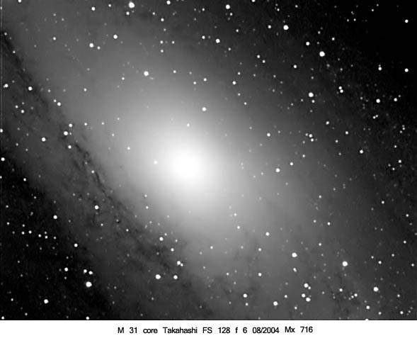 Close up del core di M110. C11 @7 -Meade focal reducer-Mx716-Arcinazzo-Agosto 2006 Notare l'arco di materia scura che circonda il nucleo, sulla destra. Close up of M110 core -C11 @7- August 2006 Note the dark matter arc that surrounds the nucleus